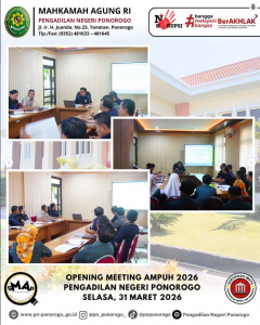 Selasa (31/03), Pengadilan Negeri Ponorogo secara resmi melaksanakan Opening Meeting Sertifikasi Mutu Pengadilan Unggul dan Tangguh (AMPUH) Tahun 2026. Kegiatan ini merupakan langkah nyata dalam menjaga dan meningkatkan kualitas layanan peradilan.