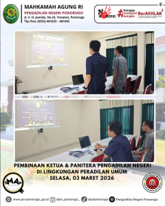 Bertempat di Ruang Media Center Pengadilan Negeri Ponorogo, turut hadir Ketua dan Panitera Pengadilan Negeri Ponorogo dalam Kegiatan Pembinaan Ketua dan Panitera Pengadilan Negeri di Lingkungan Peradilan Umum pada Hari Selasa, 03 Maret 2026. Kegiatan ini menjadi wujud komitmen dalam memperkuat integritas dan meningkatkan kualitas pelayanan kepada masyarakat.