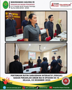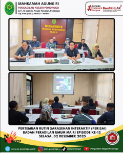 Bertempat di Ruang Media Center Pengadilan Negeri Ponorogo, turut hadir Ketua, Wakil Ketua, para Hakim, Panitera, dan Panitera Muda Pengadilan Negeri Ponorogo dalam acara Pertemuan Rutin Sarasehan Interaktif (PERISAI) Badilum Mahkamah Agung RI Episode 12 secara daring dari Satuan Kerja masing-masing.